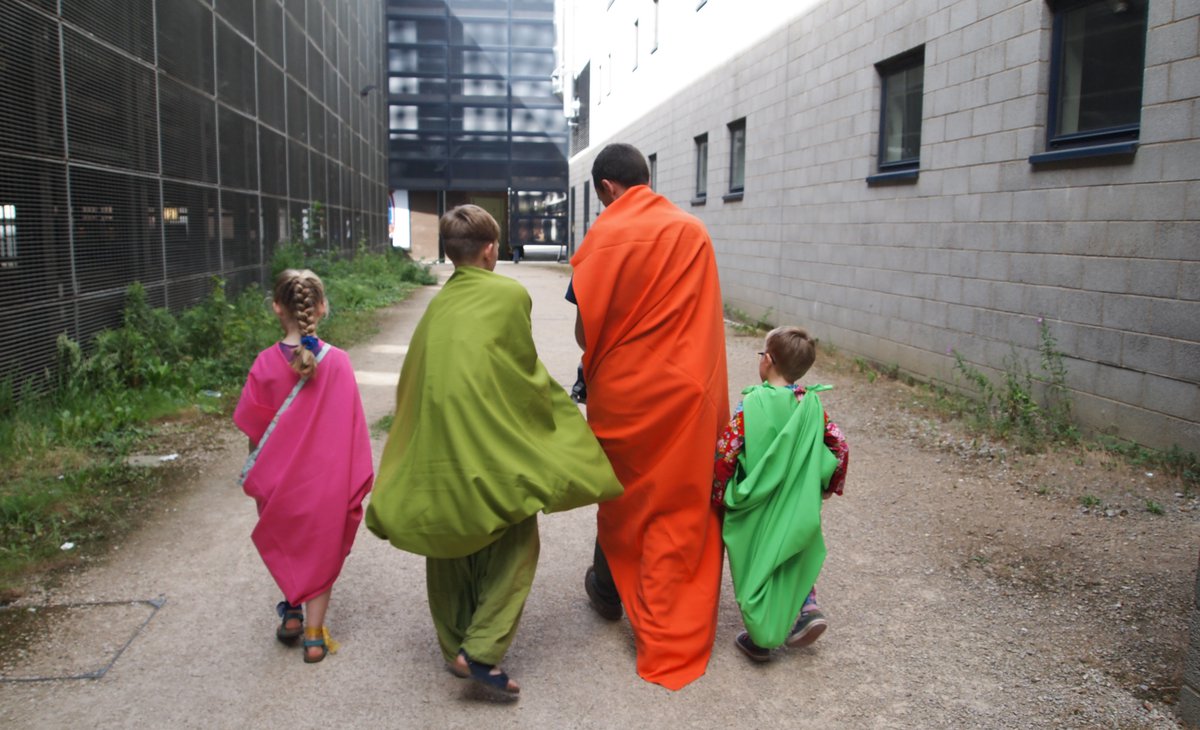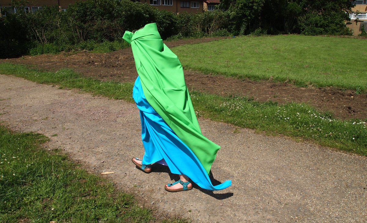Townley and Bradby have been commissioned by MK Gallery as part of two-year residency project Playing Out to explore Conniburrow and Central Milton Keynes. In collaboration with fellow artist Georgie Manley they have begun to consider ways to occupy Conniburrow’s outdoor spaces offering for example ‘Child-led Tours’ and the repurposing of objects through planting. They have spent time in Conniburrow’s green spaces known by some residents as ‘out the back’. They have worked with artist and Conniburrow resident Sarah Wright, who introduced them to the new Community Orchard. They have used green spaces as an outdoor studio where found objects can be gathered and repositioned, and new elements, like coloured cloths, can be added in. And they have explored different ways of moving through the retail areas of CMK.
