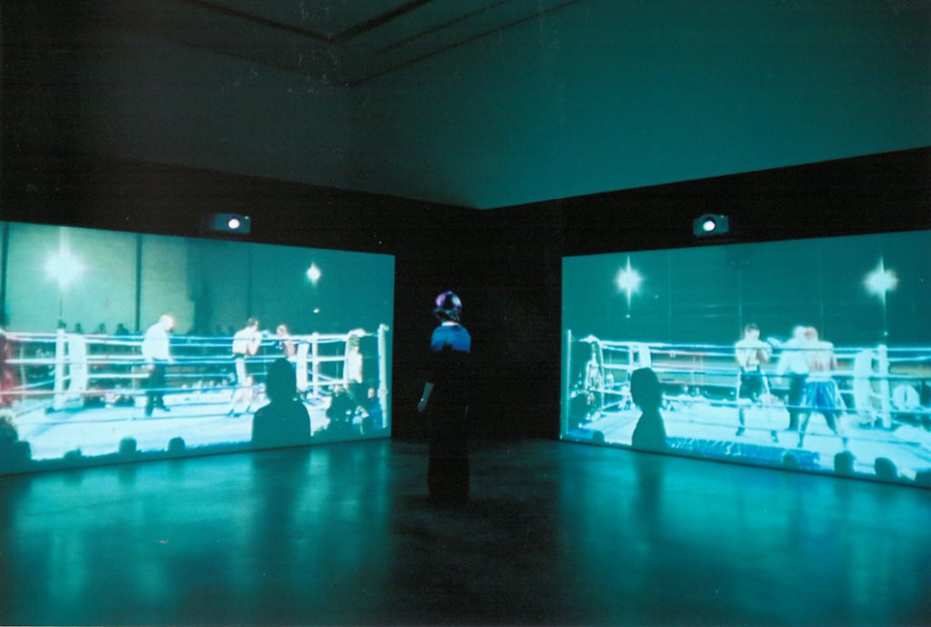 Wallinger’s reference to sport features significantly in his work. Football and horseracingare used to exaggerate the social divisions of race, class and religion. The artist combines his interest as a fan with critical observation fuelling a personal and passionate interest. Cave develops Wallinger’s use of sport as subject by changing the context in which spectator and viewer interact. The boxing ring is the arena recreated in the gallery space in the form of a large four-screen video installation in which two boxers fight a round at quarter the normal speed. As the three minutes stretch to twelve, it is the clarity of the space itself that comes to impress us. The individual shouts and group encouragement from the audience become animalistic howls as the fight replays in slow motion. Drawing on all the noise and feeling surging in the arena, with its particular sound and imagery, Cave explicitly magnifies the conflicting emotions aroused by the sport, from the collision of desire and disappointment to the coexistence of anticipation and revulsion.